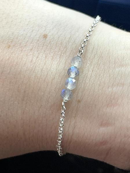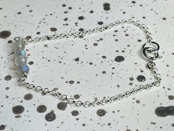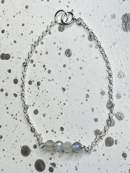 Pulseira de corrente de elo português em prata 925 com entremeio de quatro pedras naturais. Pedras naturais: labradorite. Possibilidade de personalização. Comprimento: 15cm