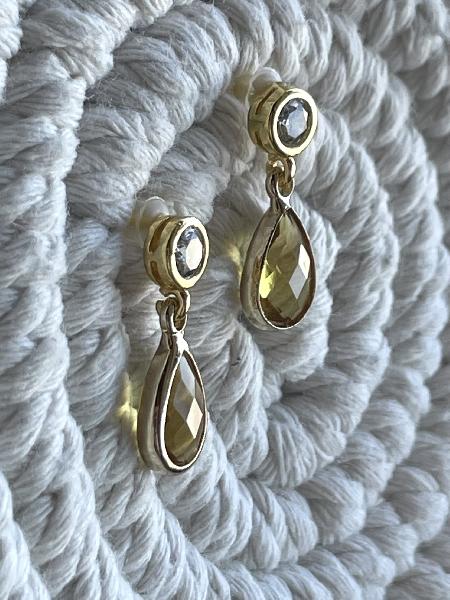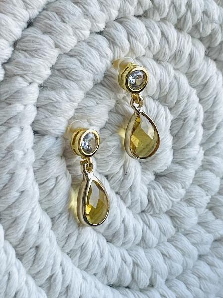 Brinco de base redonda pequena em latão banhado a ouro com uma zircónia central e um pendente em formato gota de vidro sintético de cor amarela torrado com aro dourado. Possibilidade de personalização: base disponível em prateado e dourado, e gota também disponível em várias cores e com o aro circundante em prateado e dourado. Base:6mm Gota: 1,4cm Tamanho total: +/- 2cm