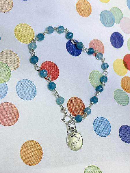 Pulseira de elo manual em prata 925 rodeada de pedras naturais, com medalha de 1,1cm gravada à mão. Possibilidade de personalização. Possibilidade de alteração das pedras naturais. Pedras naturais: calcedónia azul.