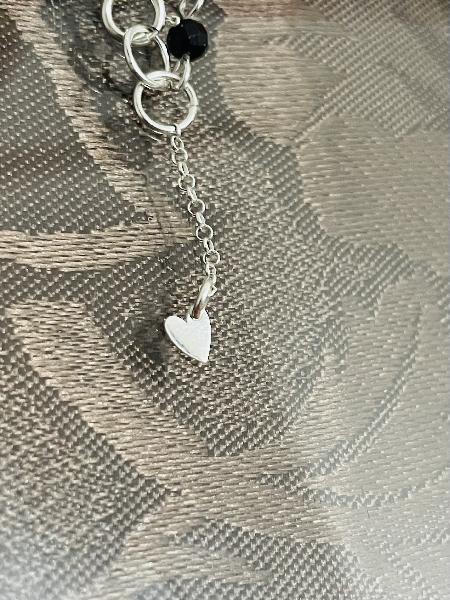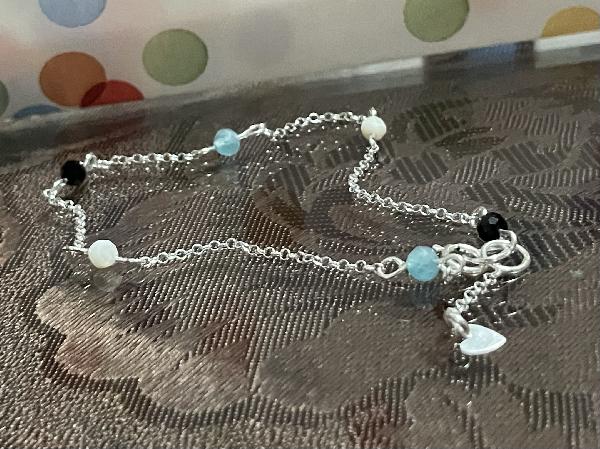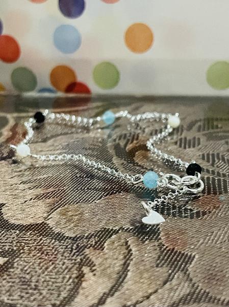 Tornozeleira em corrente de elo português em prata 925, com entremeios em prata com pedras naturais de cor azul capri, preto e branco. Corrente de efeito pendente com coração também em prata 925. Pedras naturais: calcedónia azul, ágata preta, opala. Feita por medida. Possibilidade de personalização.