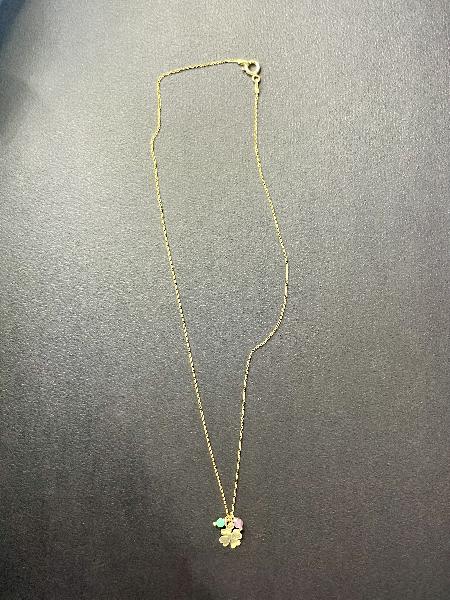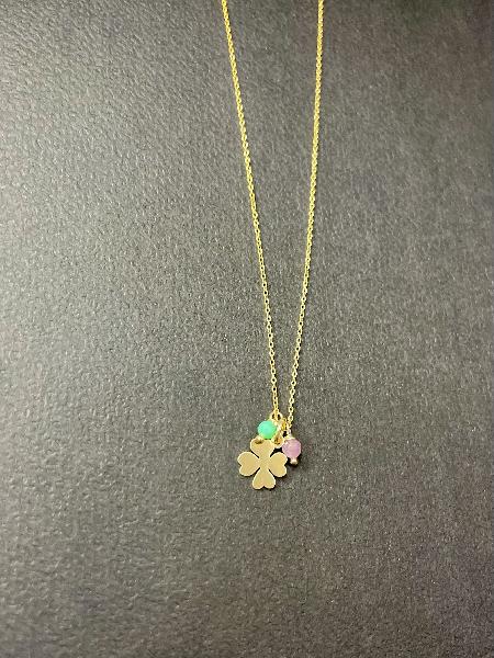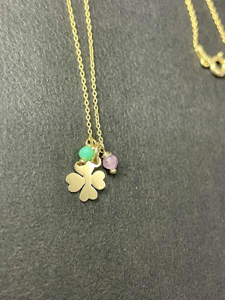 Fio de corrente bilbao em prata banhada a ouro, com trevo também em prata banhada a ouro e 2 pedras naturais laterais em mini pendente. Pedras naturais: crisoprase e jade roxo. Possibilidade de personalização das pedras naturais. Possibilidade de alterar as cores. Disponível em prateado e dourado.