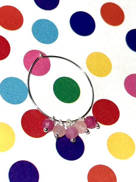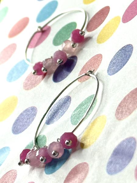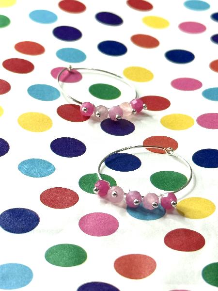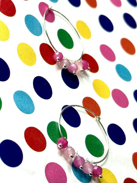 Argolas totalmente em prata 925 com pendentes de pedras naturais rosa barbie e rosa claro. Tamanho das argolas: 2,5cm Quantidade de pedras naturais: 5 em cada argola. Pedras naturais: turmalina rosa e quartzo rosa. Possibilidade de personalização. Disponível em vários tamanhos. Disponível apenas em prateado.