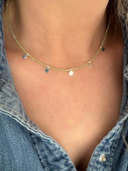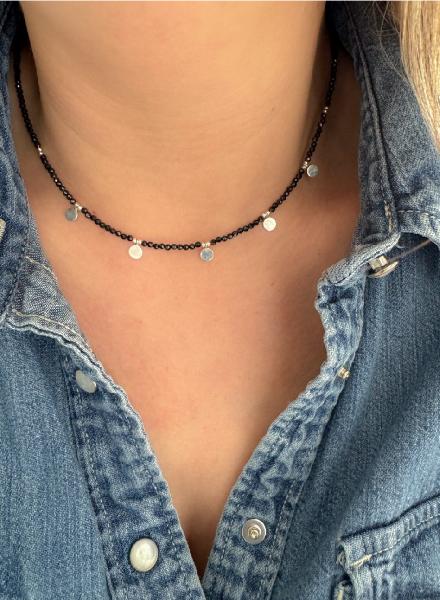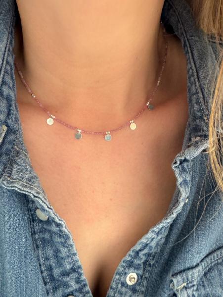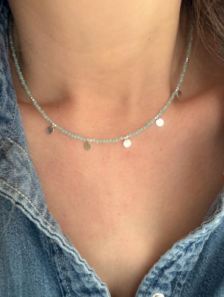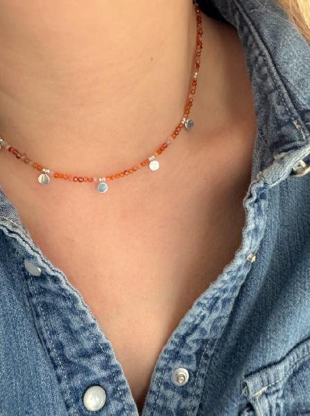 Fio de pedras naturais com 2mm cada e 5 medalhas de 5 mm em Prata 925. Fecho igualmente em Prata 925. Disponível em branco (pedra da lua), azul escuro (lapis lázuli), preto (espinélio), azul claro (amazonite), laranja (ágata laranja), rosa claro (turmalina rosa), verde claro (perídoto). Tamanho: 40cm + 5cm de extensão