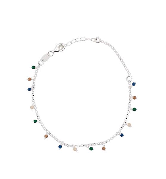 Pulseira com 15 pedras penduradas na corrente de cores sortidas (rosa, castanho, verde e azul), feita em Prata 925. A pulseira tem 18cm de comprimento e um extensor de 3cm. Possibilidade de personalização.