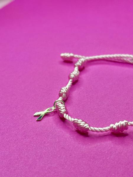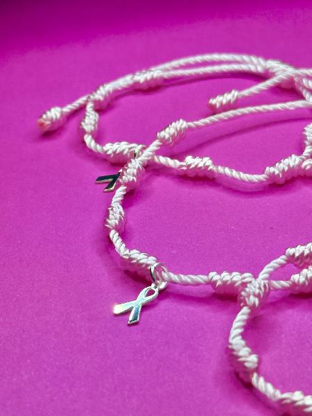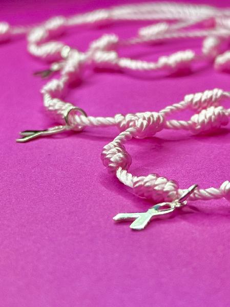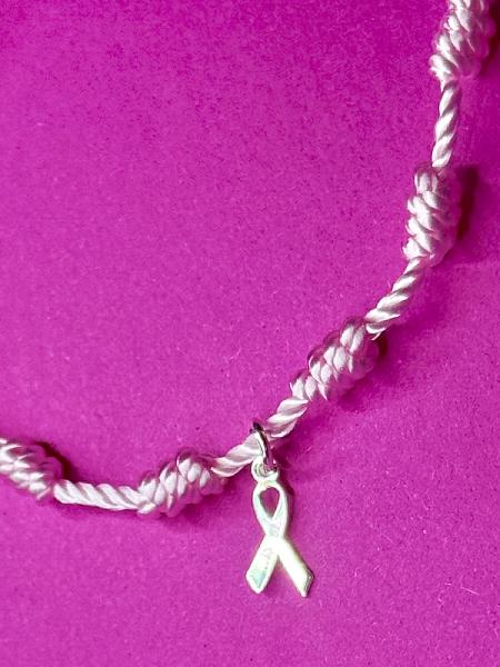 Pulseira de 7 nós em rosa claro com pendente de laço solidário em Prata 925. Este artigo é símbolo da luta e prevenção contra o cancro da mama. O rosa simboliza amor, ternura e paz interior. A pulseira dos 7 nós na cor rosa é considerada um amuleto de proteção contra as más energias, ao mesmo tempo que atrai harmonia e boa sorte. O laço solidário representa a luta contra o cancro de mama, um símbolo de coragem, prevenção e amor à vida. Pulseira de tamanho único, ajustável.