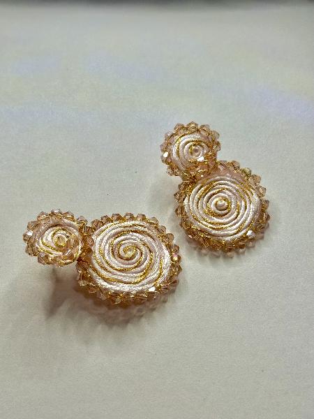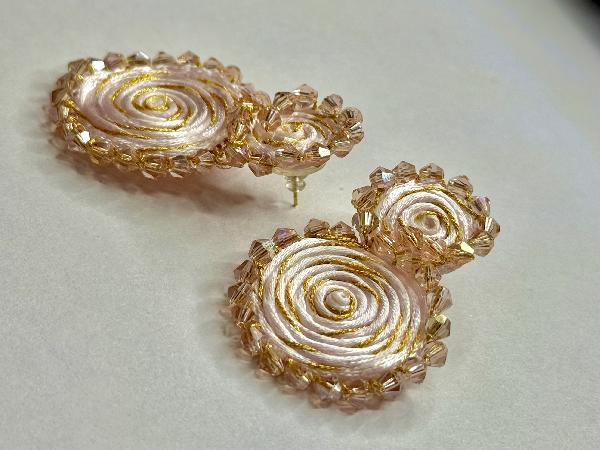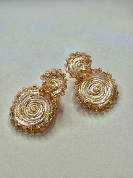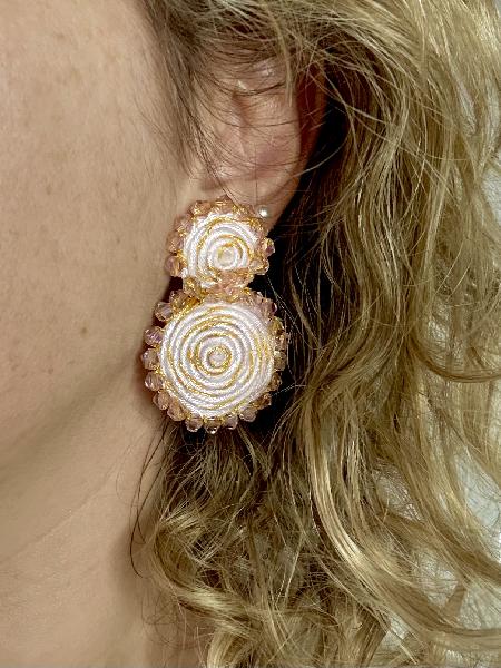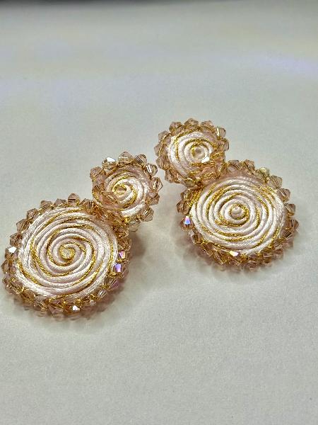 Brincos em fio de seda rosa pastel e fio dourado, rodeados de cristais checos em rosa claro. Totalmente feito à mão. Personalizável.