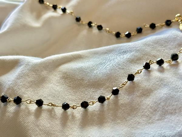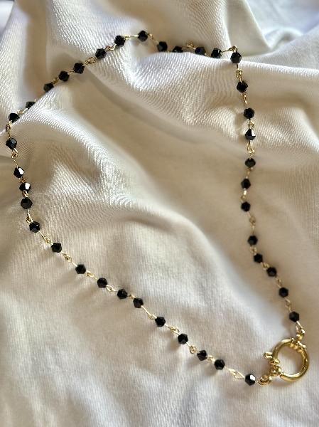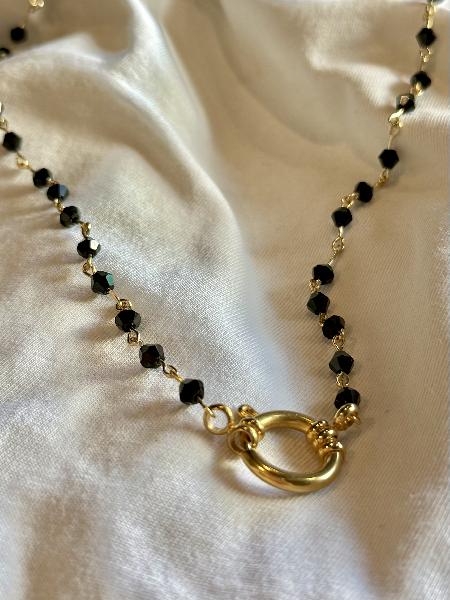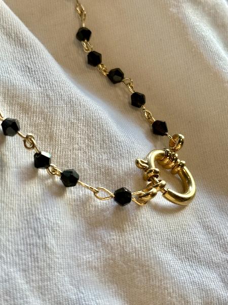 Fio de elos manuais em aço inoxidável dourado, com cristais checos em preto brilhante. Fecho bóia grande. Totalmente em aço inoxidável dourado. Feito por medida.