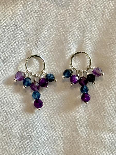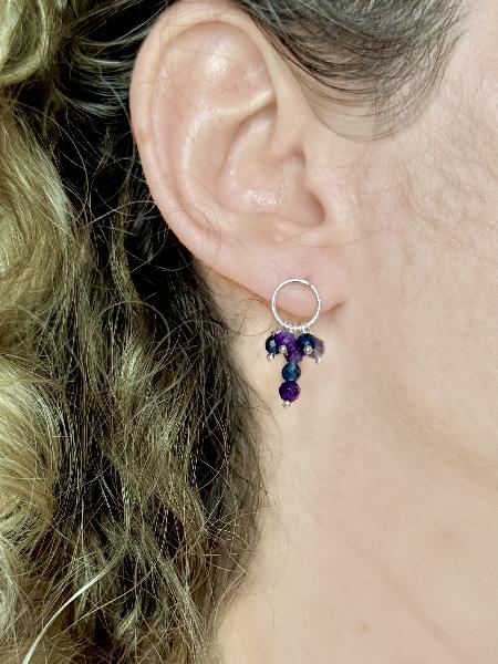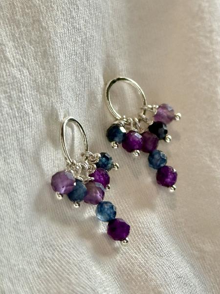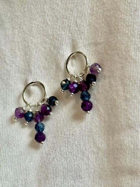 Brincos de base redonda com pendentes de pedras naturais nas cores roxo e azul: safiras azuis e ametistas. Totalmente em Prata 925. Feitos à mão. Possivelmente de personalização.