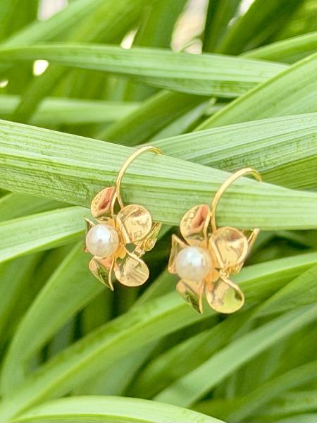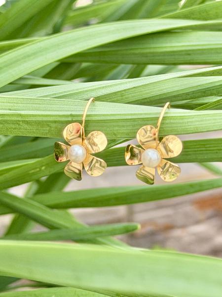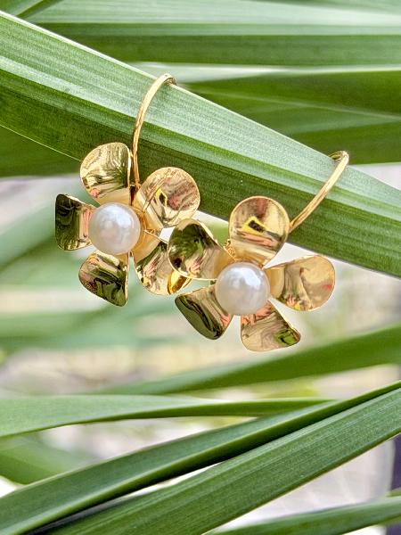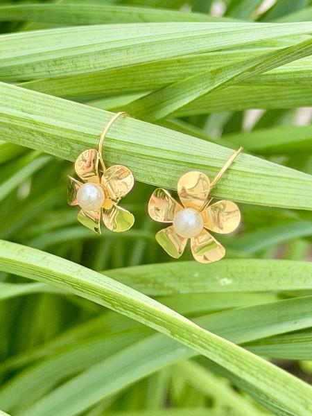 Brincos de gancho em aço inoxidável dourado, com flor lisa pendente e pérola central. Apenas disponível em dourado.