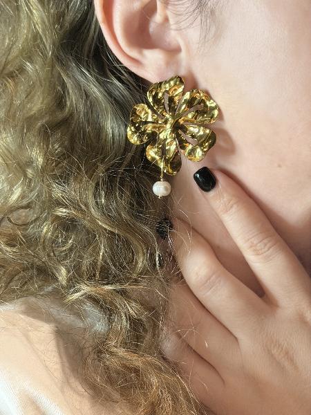 Brincos flor de pétalas rasgadas de tamanho grande com pérola de rio como pendente. Totalmente em aço inoxidável dourado. Apenas disponível em dourado. Possibilidade de personalização.