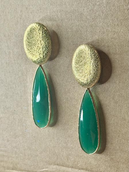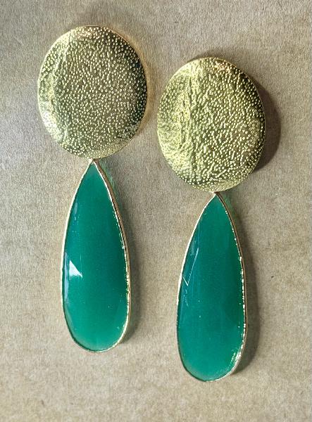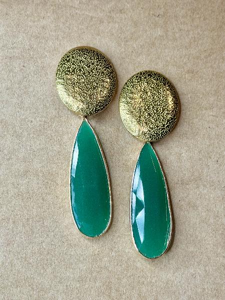 Brincos de base clássica redonda martelada em aço inoxidável dourado, com pendente gota alongado em verde. Possibilidade de personalização. Apenas disponível em dourado.
