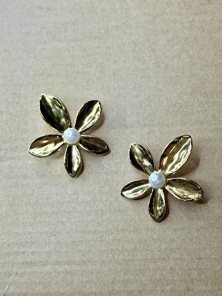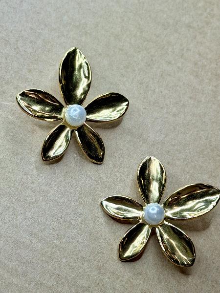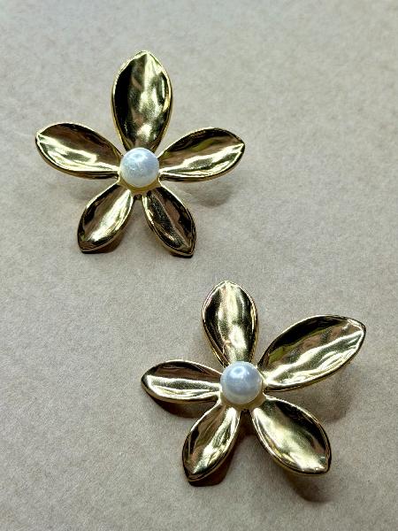 Brincos flor com pérola sintética central em branco desgastado. Totalmente em aço inoxidável. Apenas disponível em dourado.