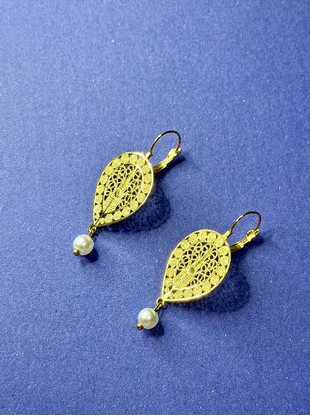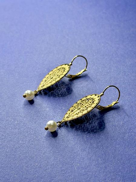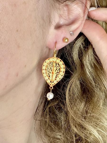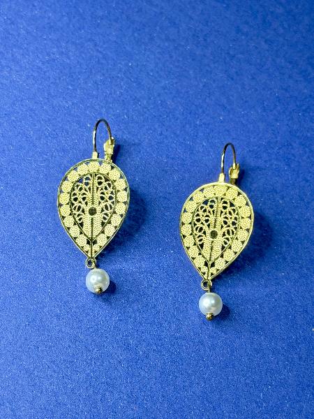 Brincos inspirados na tradição portuguesa, em aço inoxidável dourado, com delicado detalhe rendilhado e pérola ABS suspensa. Medidas: 49 x 19 mm Apenas disponível em dourado.