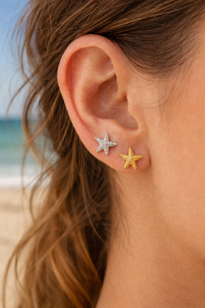 Brincos estrela-do-mar com um tamanho de 10 mm, inclui tarraxa, em prata 925. Perfeito para dar um look de Verão a qualquer estilo. Disponível em pratedo e dourado.