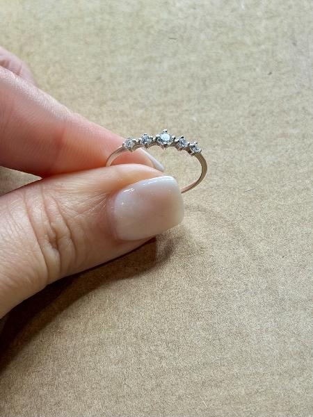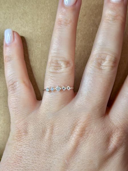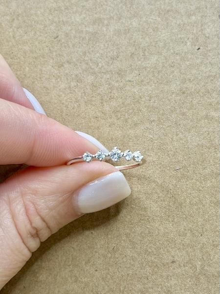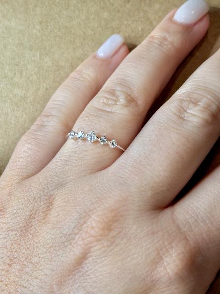 Anel com 5 zircónias: 4 mais pequenas, com um diâmetro de 2mm e outra no meio, maior que as restantes, com um diâmetro de 3mm. Totalmente em Prata 925.