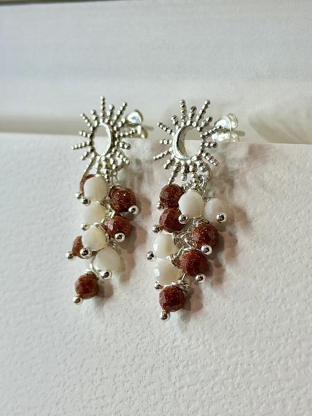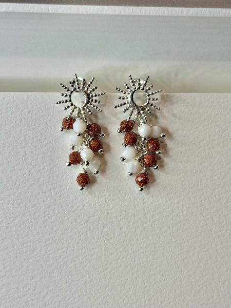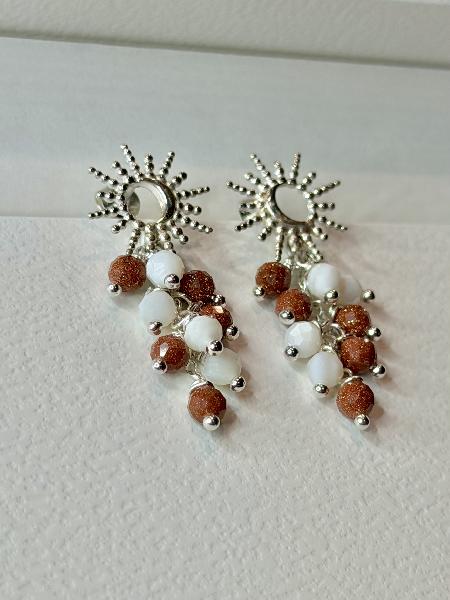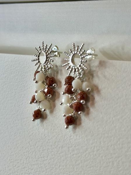 Brincos de base sol/ lua em Prata 925 com cascata de pedras naturais: moonstone e sunstone. Totalmente em Prata 925. Apenas disponível em prateado.