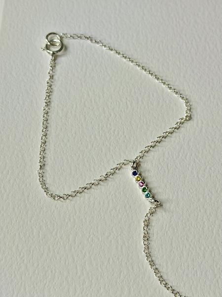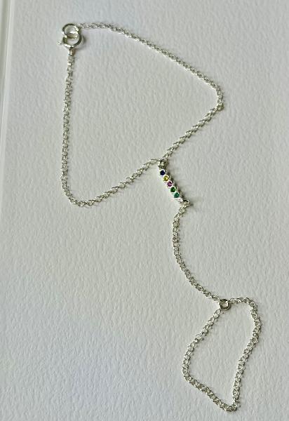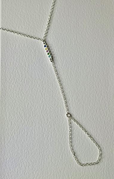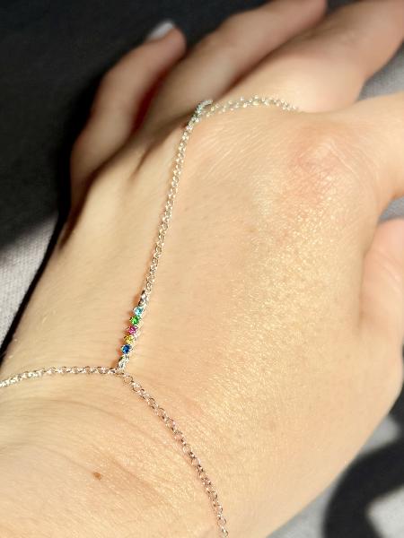 Hand chain (pulseira com entremeio e anel) em corrente de elo português, totalmente em Prata 925. Entremeio de zircónias coloridas, projetando união ao anel. Disponível em prateado e dourado. Entremeio disponível com zircónias brancas.