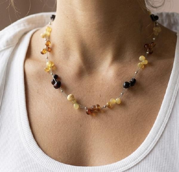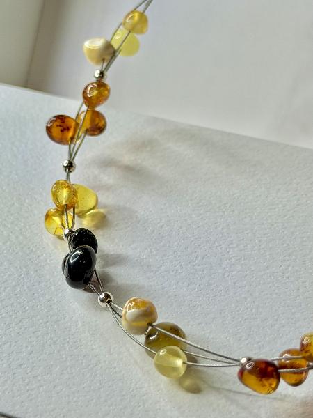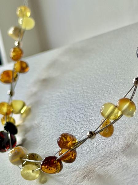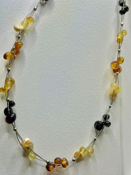 Colar de adulto de Âmbar Báltico, feito à mão em banda flexível de prata, feito de contas de âmbar polido de várias cores. Com 45cm.