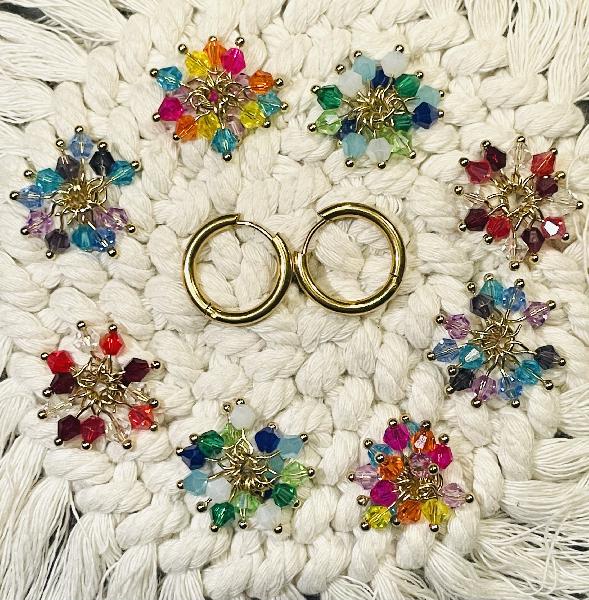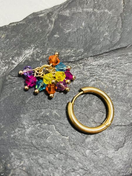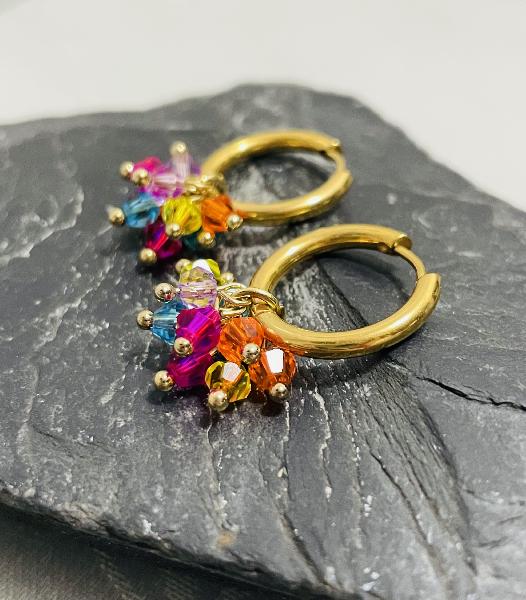 Argolas simples em aço inoxidável dourado com encaixe removível de cristais checos nas cores laranja, rosa choque, lilás e azul turquesa. Possibilidade de personalização: argolas disponíveis em dourado e prateado. É possível realizar um conjunto com mais pares de encaixes removíveis de cores diferentes. * Extra por cada par de encaixes pedido. Medida das argolas: 19mm Espessura: 2,5mm