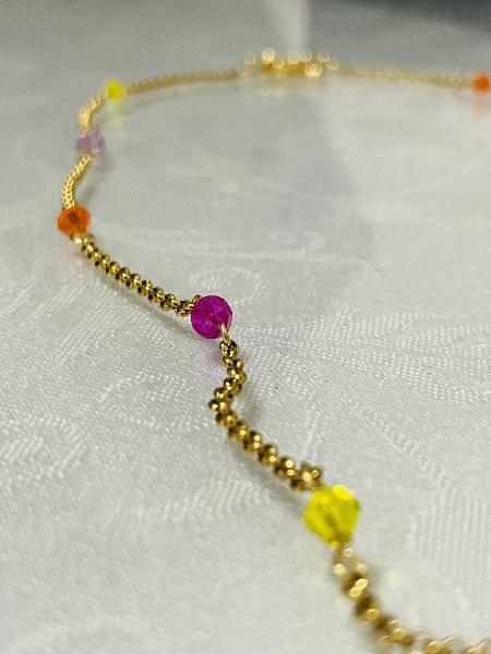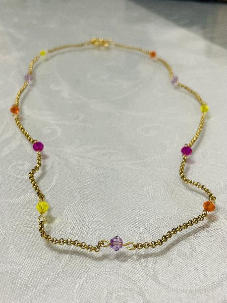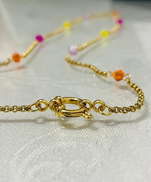 Fio de corrente de elo em aço inoxidável dourado com elos de união com cristais checos nas cores amarelo, laranja, lilás e rosa. Possibilidade de personalização: corrente de elo disponível em prateado e dourado. É possível alterar as cores dos cristais checos.