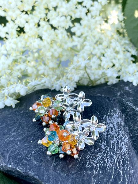 Brinco de base 3 flores em latão banhado a ródio com cristais checos nas cores: laranja, azul médio, verde e amarelo.