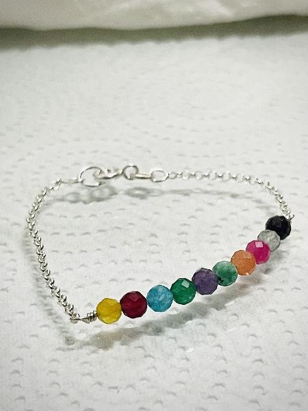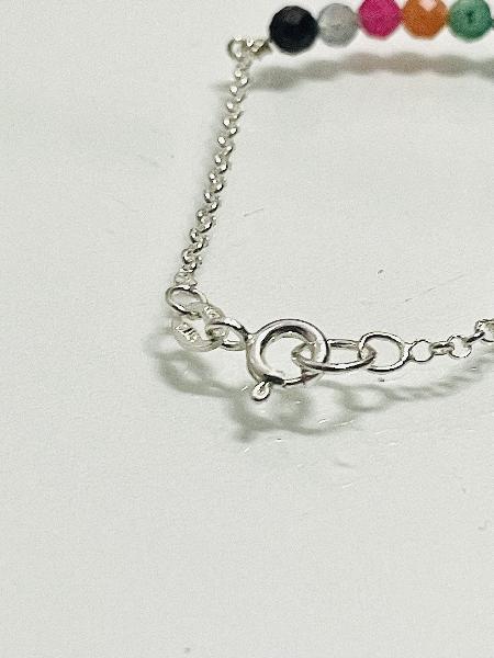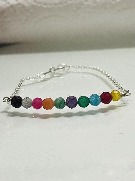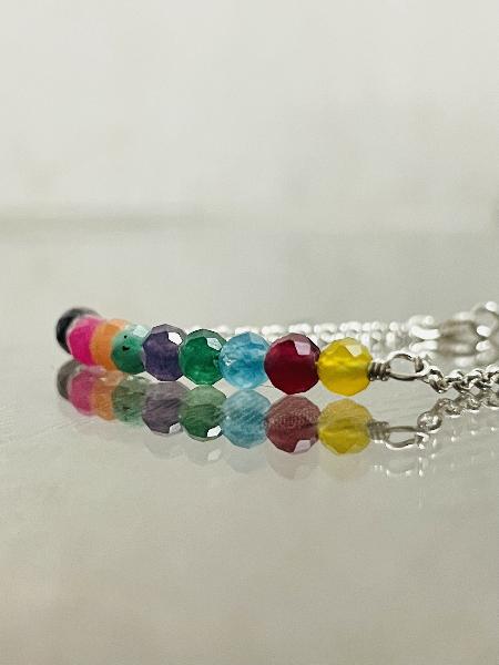 Pulseira em corrente de elo português com entremeio em fio de prata, adornada com pedras naturais. Feita exclusivamente para retratar cada um dos sentimentos do filme Inside Out- Divertidamente. Pedras naturais: ágata amarela, rubi, calcedónia azul, jade verde, ametista, zoisite, calcedónia laranja, turmalina rosa, labradorite, granada.