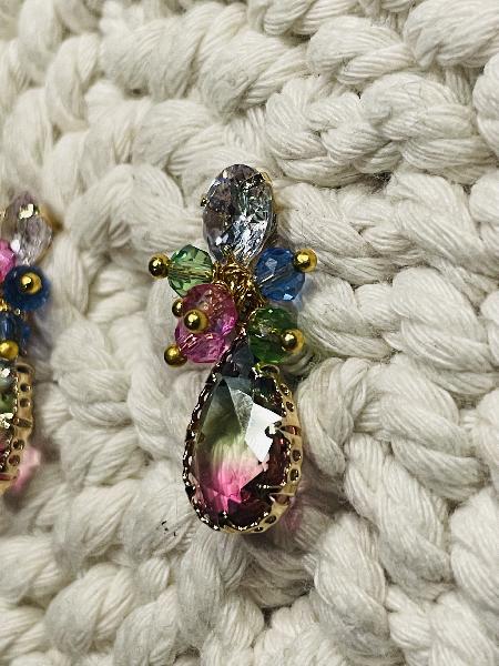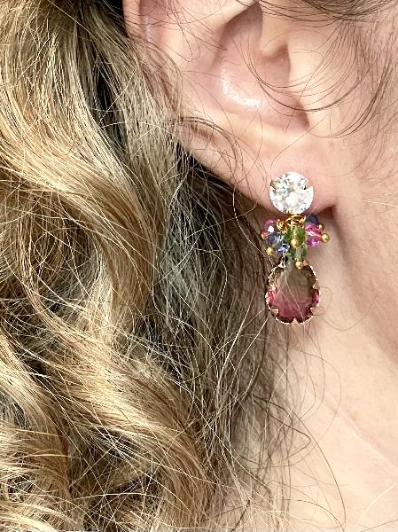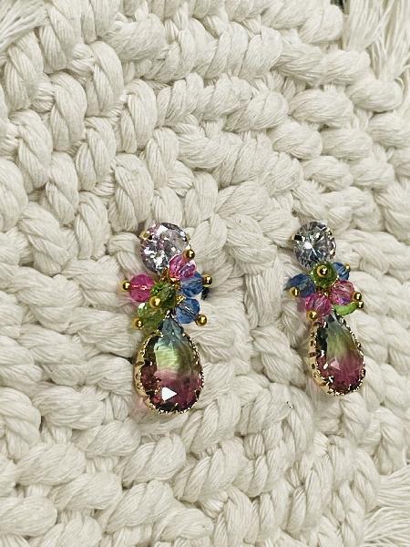 Brincos de base de garras com zircónia média central, com cristais austríacos nas cores rosa barbie, azul e verde, e um pendente gota com um dégradé na mesma cor. Possibilidade de personalização. Base disponível em dourado e prateado.