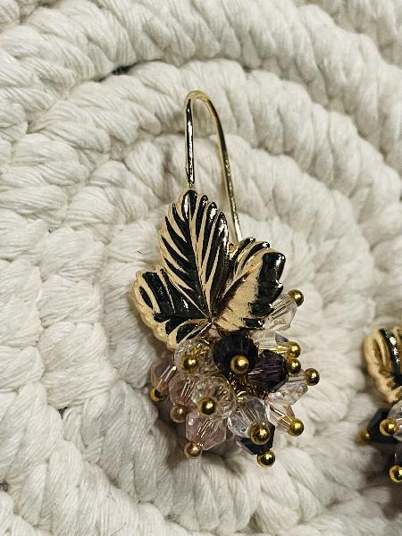 Brincos de base 3 folhas em gancho em aço inoxidável dourado com cristais checos nas cores: ameixa, rosa velho e transparente.
